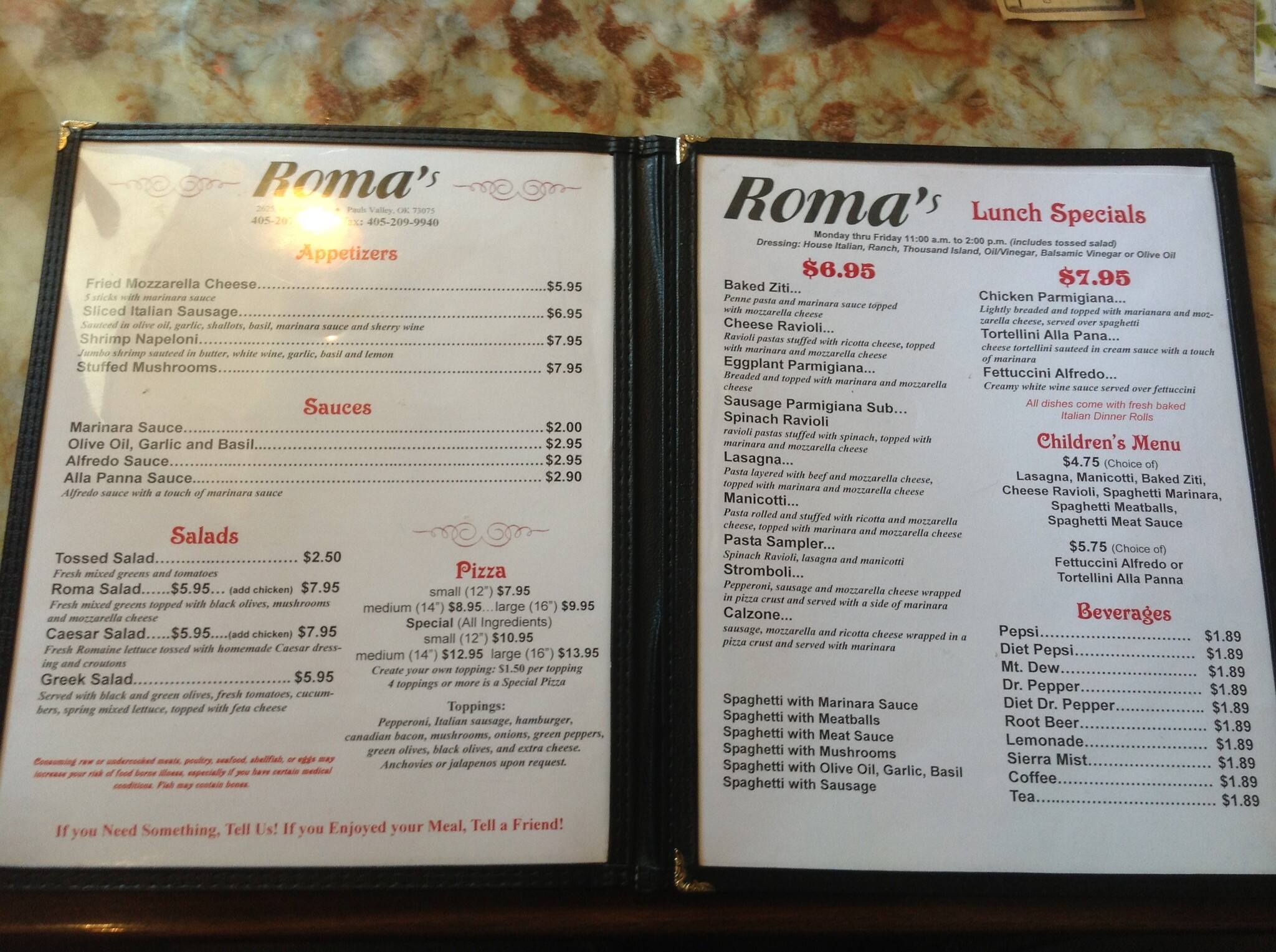 Roma S Italian Restaurant Menu